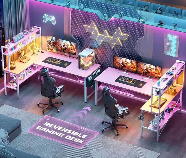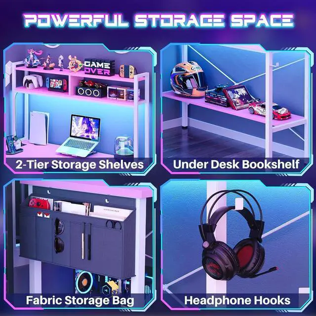 Reversible L Shaped DeskThis 59' ' L shaped gaming desk comes with power outlet, light strip, storage shelves, headphone hook and storage bag for home office or gaming. The reversible design and the top hutch can be fixed on the left or right side according to your needs, perfect fit perfectly in the corner while providing maximum space. A great choice for home office, game, and living room.