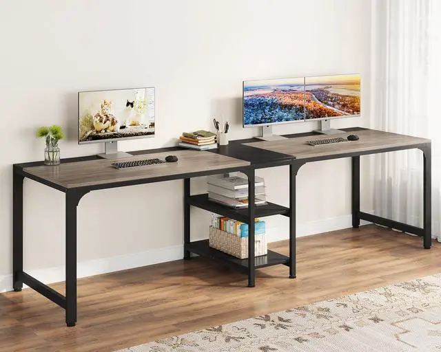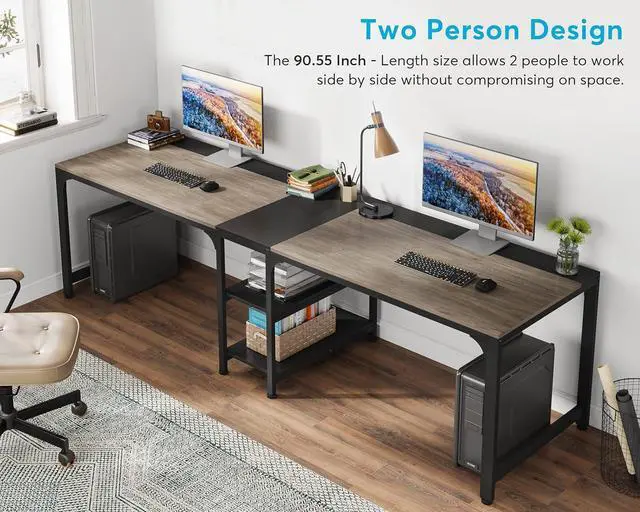 Large Storage: The double computer desk combines charming style and functional design, 90.55 ' ' x 27.56 ' ' tabletop provides the room you need for office essentials like your laptop, stacks of folders, and notepads. Attached with 2-tier storage shelves to put your printer, books, files, plants, and office supplies. Defining your space whatever you need.