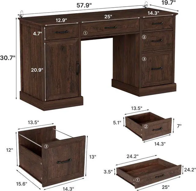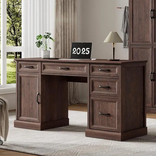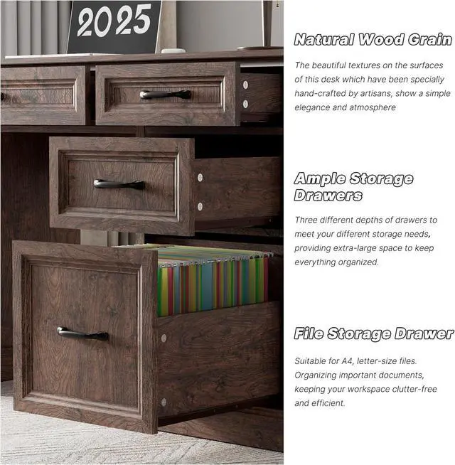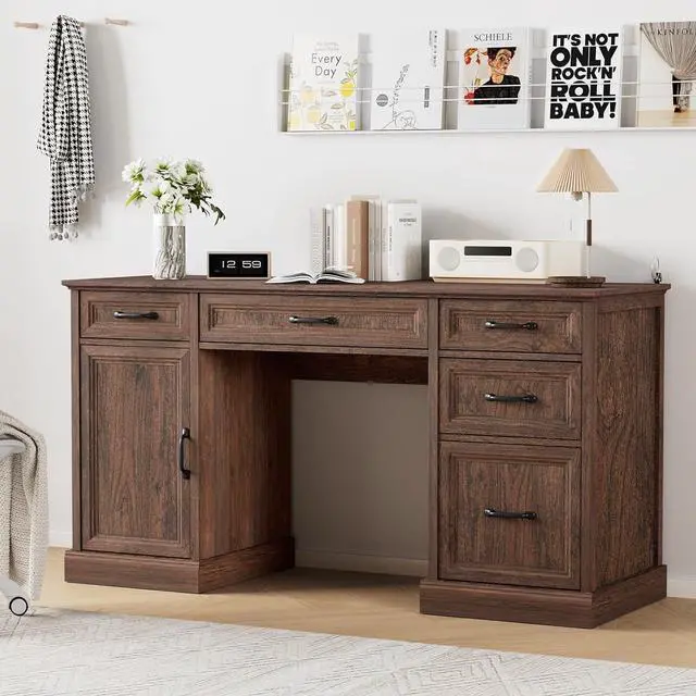 Durable Storage SolutionsFarmhouse Home Office Desk Equipped with 4 deep drawers and a built-in cabinet, this desk with file drawer offers ample storage for files, stationery, and personal items. The smooth-gliding drawers and sturdy construction ensure long-lasting functionality, keeping your workspace clutter-free.