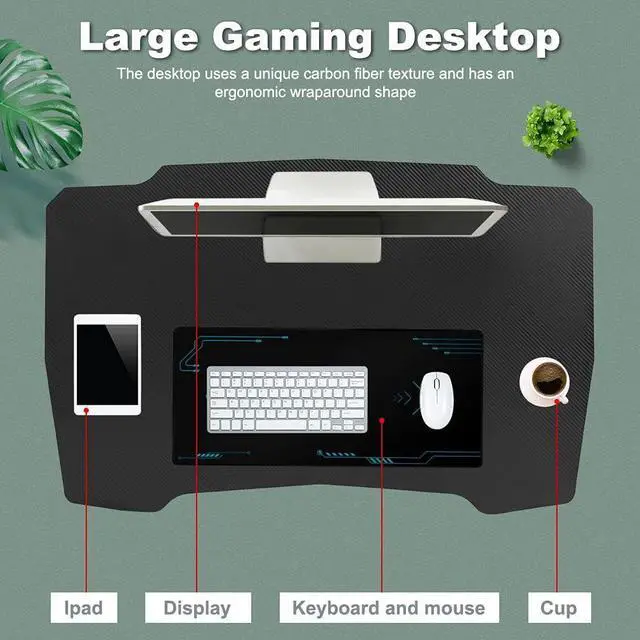 Large SurfaceThis gaming desk workstation provides massive space for PC, gaming keyboards, gaming monitors and other gaming gear. Smooth carbon fiber texture surface for a comfortable gaming experience.