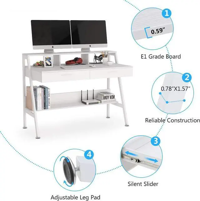 Tribesigns Computer Desk with Storage Shelf & Drawers, Modern 47 inch Office Writing Desk Study Table with Monitor Stand Riser for Home Office Use (White)
