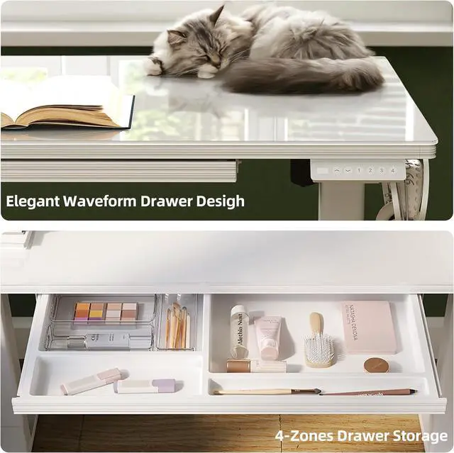 Spacious Storage Drawer: our glass standing desk designed with a built-in drawer to provide ample storage space. The spacious drawer has 4 zones, ensuring a clutter-free and orgnized desktop