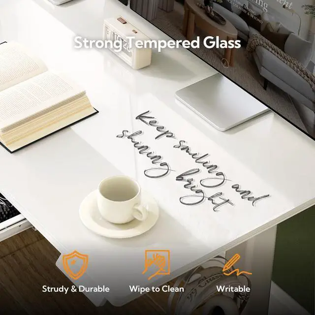 Ultra-White Glass top: The sleek ultra-white tempered glass top of our standing desk adds a modern and elegant touch to any office or home, offering durability and easy maintenance. And you can also jot down notes directly on the adjustable desk with dry-erase markers because it' s easy to clean