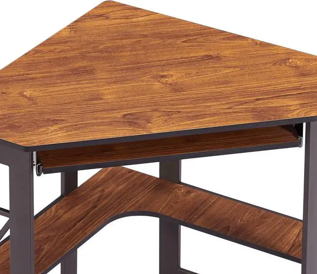 Corner desk with keyboard tray and two open shelves on the side provides working space and extra plenty of storage space.