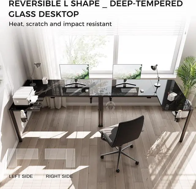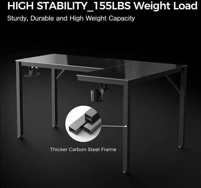 [ Reliable Support ] - 6mm thick, deep tempered glass desktop that' s waterproof and heat-resistant. Custom-grade carbon steel frame with premium powder-coated protective finish ensures sturdy & durable performance. Strengthened structure bears higher load of up to 155 LBS.
