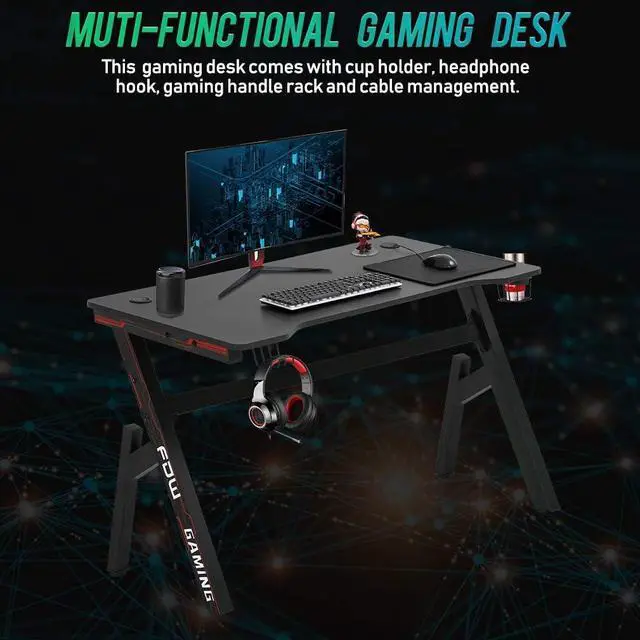 DESIRE FOR THE PERFECT GAMING SETUPThe innovative gaming desk brings together a powerful computer integrated to a desk designed especially for gaming with all the accessories in one entirety. This PC gaming pro desk comes with a cup holder, headphone hook and two Cable Management hole. It is not only a gaming desk, also a multi-functional workstation. With modern and elegant appearance, provides comfortable gaming and working environment.