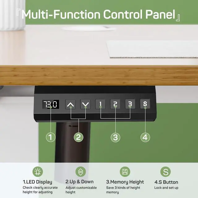 User-Friendly Controls with Memory PresetsFeatures a convenient LED display panel with 3 memory presets, allowing you to save your preferred height settings and adjust the standing desk precisely with the touch of a button, enhancing productivity and comfort.