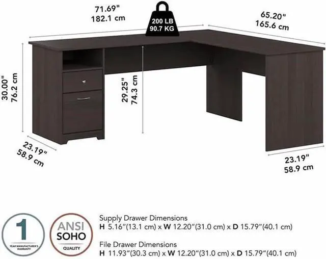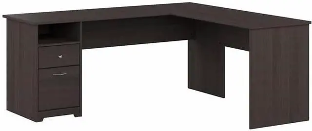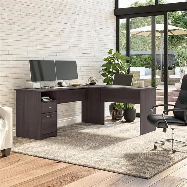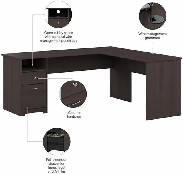 WORKSPACES MADE STYLISH: Spread out and maximize your work efforts with Bush Furniture' s Corner Desk. Our L desks for home office offer plenty of space to spread out with materials and has two drawers that comfortably hold letter, legal and A4 size files.