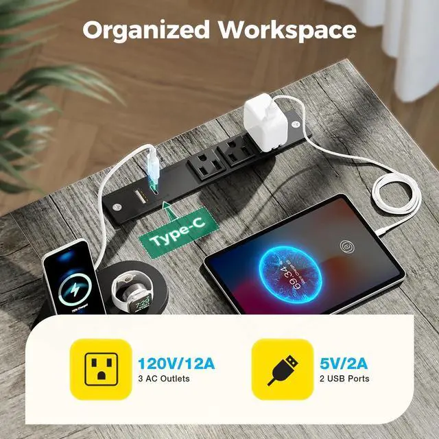 1. Power Outlets: Built-in power outlets with 3 AC ports, 1 USB, and 1 Type-C port for convenient device charging.