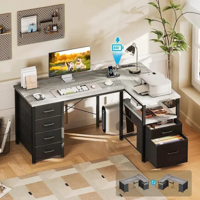 Casacomoda 55 inch Computer Desk with 5 Drawers and File Cabinet for Storage, Office Desk with Storage Shelf & Power Outlets, Home Office Desks, Gray Oak