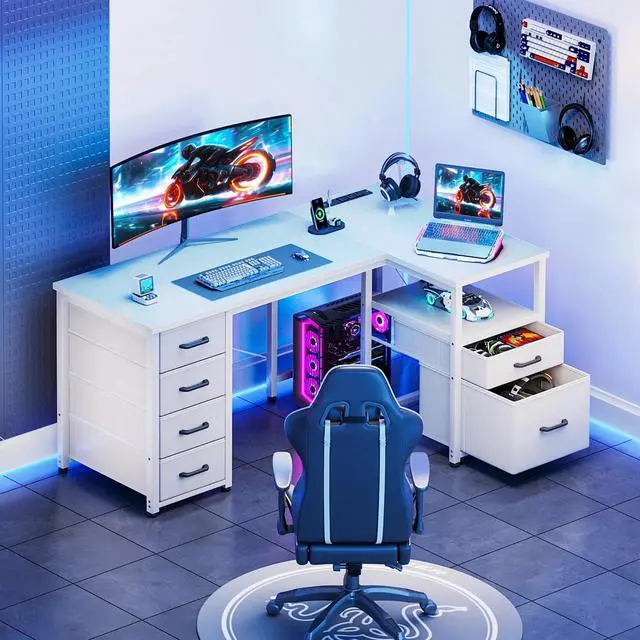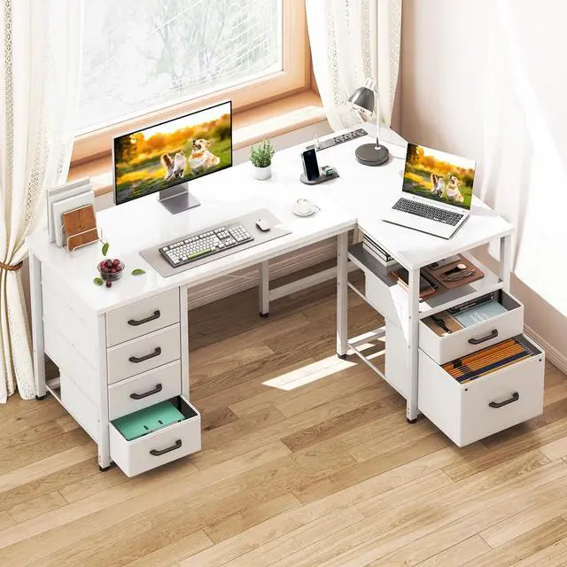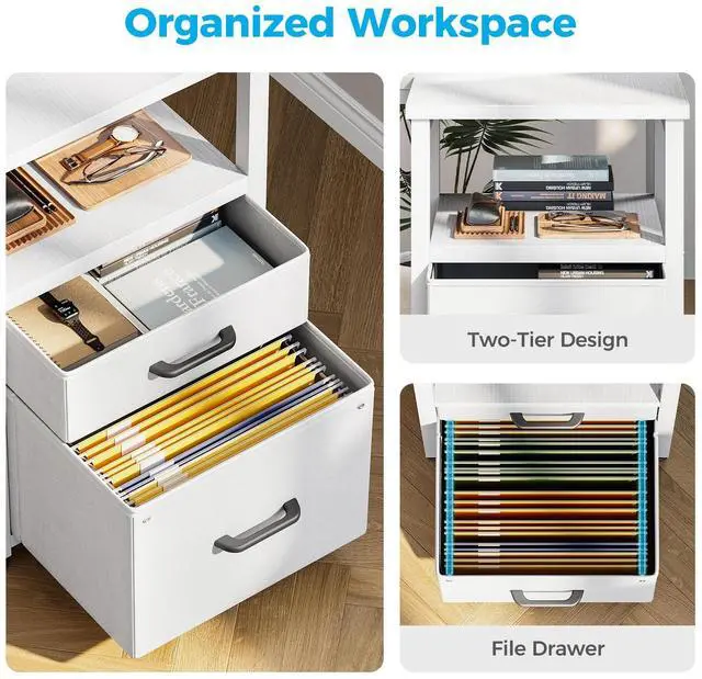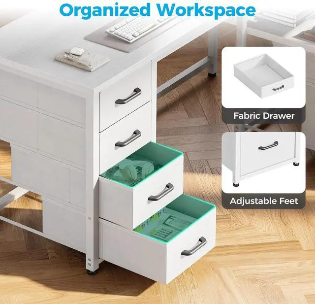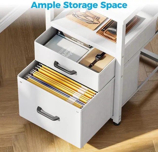 • Ample Storage: Includes five soft fabric drawers, a spacious file cabinet, and a side shelf for organized storage of documents and office supplies.