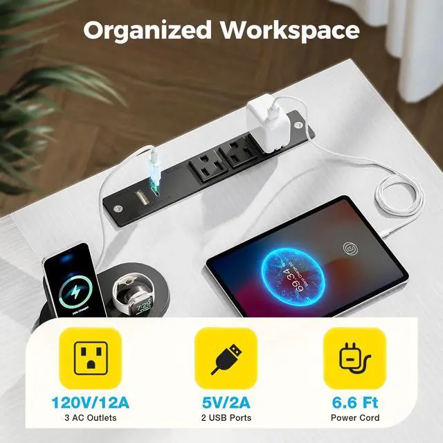 • Integrated Power: Features 3 AC outlets, 1 USB, and 1 Type-C port built directly into the desk for convenient device charging.