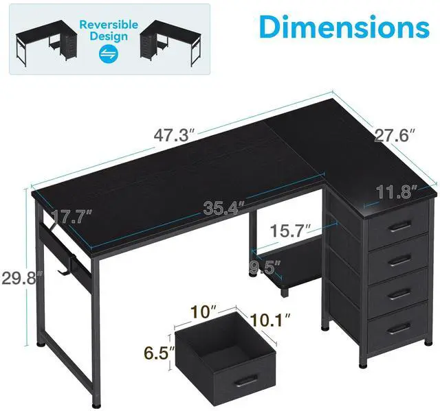 Versatile Storage: Designed for maximum organization, this desk includes 4 fabric drawers, a CPU stand, and a side hook to store books, office supplies, and accessories.