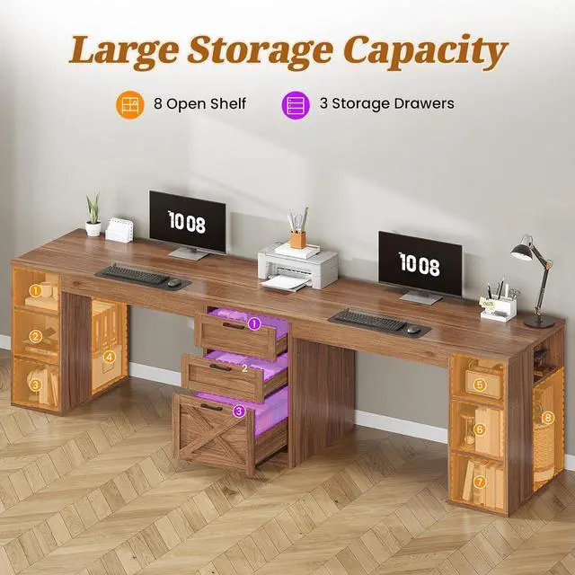 SEDETA Farmhouse 96.5" Computer Desk with Drawers, 2 Person Home Office Desk, Gaming Double Desk with Storage Shelves, Long Two Person Writing Desk, Brown