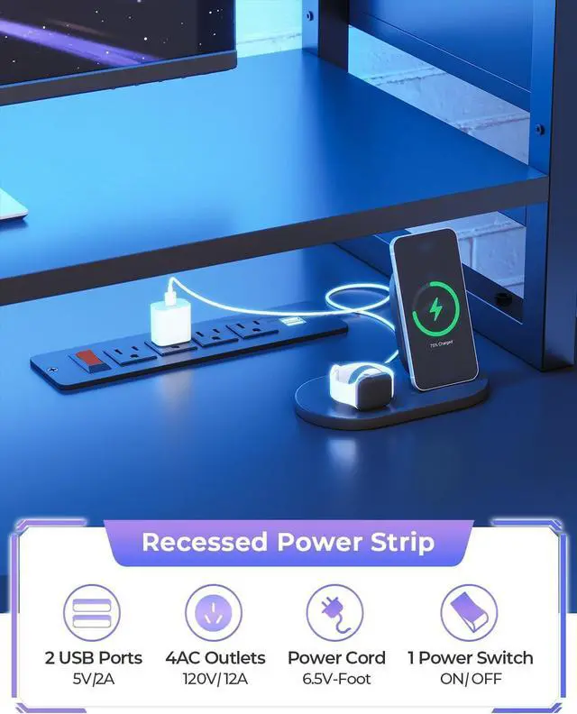Secure High-Capacity Charging Station- The computer desk is equipped with four power sockets and two USB ports, meeting the power supply demands of mu