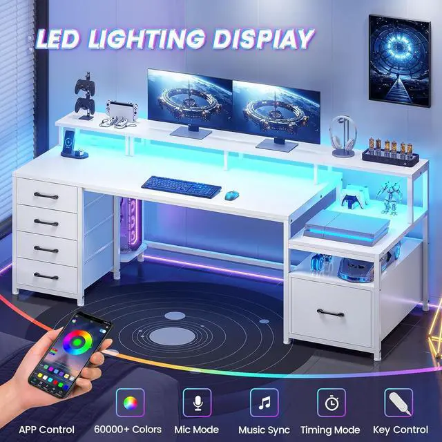 SEDETA White Computer Desk with 5 Drawer & Power Outlet, 75'' Home Office Desk with File Drawer, Storage Shelves, Printer Cabinet and Monitor Shelf, Gaming Desk with Led Lights, 23.6" W Desktop