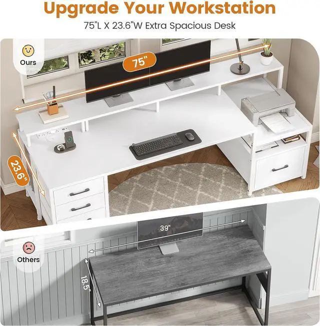 23.6W Large Desktop75"(L)*23.6"(W) dimension can easily accommodate your laptop, keyboard, books, files, desk accessories. The large workstation can hold 2 computers at the same time. Use this computer monitor riser to easily raise your monitor to just the right height, reduction of back and neck strain and pain, and frees up tons of workspace below.