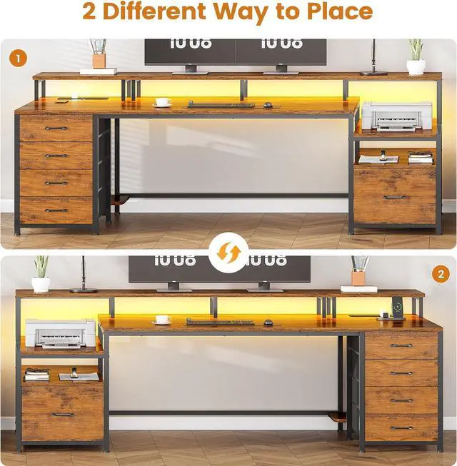 Multifunctional Computer DeskCreate a versatile workstation thatll meet all your needs with this all-in-one office desk with large computer desktop, monitor riser, file drawer, 5 storage drawers, power outlet, printer cabinet, CPU stand and led light; An ideal desk for small rooms or limited spaces to create excellent home office space.
