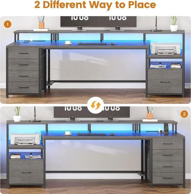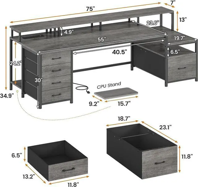 5 Large Storage DrawersComing with a file drawer, fabric storage drawers, printer cabinet and open shelves with powerful storage space. File cabinet can hold letter/A4/legal files. This solid constructed computer desk could hold printers, scanners, fax machines and any other office machines, keeps printer or scanner within easy reach of your desk to free up work space.