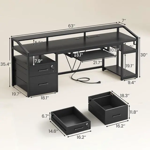 What can you get? Computer desk comes with a file drawer for Legal/Letter/A4 size files, a small lockable drawer, a power outlet, an LED light, a keyboard tray, a printer storage space, an extra long monitor stand that can hold 3 monitors, 2 storage shelves, and CPU stand. An ideal office desk for small rooms to create excellent home office space.