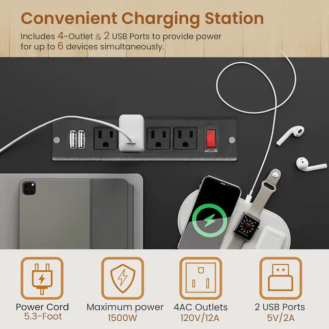 MultifunctionalHome office desks equipped with 4 AC outlets and 2 PowerIQ-enabled USB charging ports with a switch to provide power for up to 6 devices simultaneously. The monitor stand can easily raise the monitor to a suitable height, reducing the tension and pain of the back and neck. The keyboard tray is ideal for a 108-key or 87-key keyboard + mouse, which can free up more desktop space. CPU stand protects the host from moisture and dust.