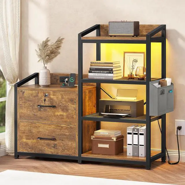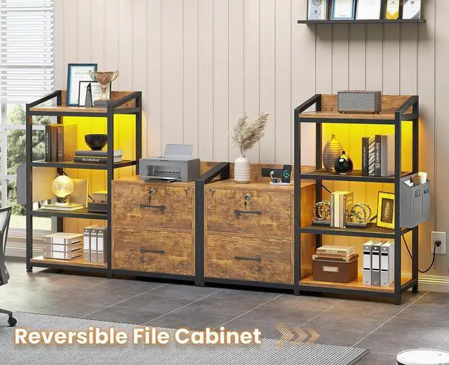 SEDETA 35.4 File Cabinet, Filing Cabinet fits Letter/A4 Size, 2 Drawe File Cabinets for Home Office with Power Strip, LED Lights, Lock, Open Shelf, Rustic Brown