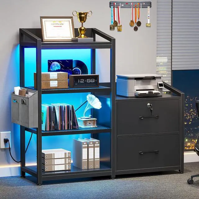 SEDETA 35.4 File Cabinet, Filing Cabinet fits Letter/A4 Size, 2 Drawe File Cabinets for Home Office with Power Strip, LED Lights, Lock, Open Shelf, Black