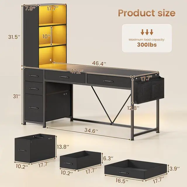 Smart Storage Revolution4 heavy-duty non-woven drawers + 1 file cabinet (holds Letter/A4/Legal size docs) conquer desk chaos. Store daily items, books, files or game figure, collect trophies, and souvenirs in the 3-tier vertical bookshelf, stash snacks/stationery/accessories in the hanging storage bag.