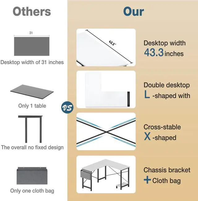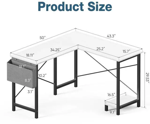 Spacious Workspace: This 50-inch L-shaped computer corner desk offers ample surface area for laptops, monitors, textbooks, and coffee mugs, promoting organization and focus for various tasks.