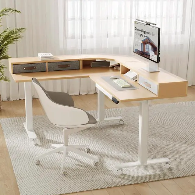 Dual Motor 63" L Shaped Standing Desk with 4 Drawers, Electric Height Adjustable Sit to Stand Coner Desk W/Monitor Stand & Splice Board, Stand up Computer Desk for Home Office,White Top Nature