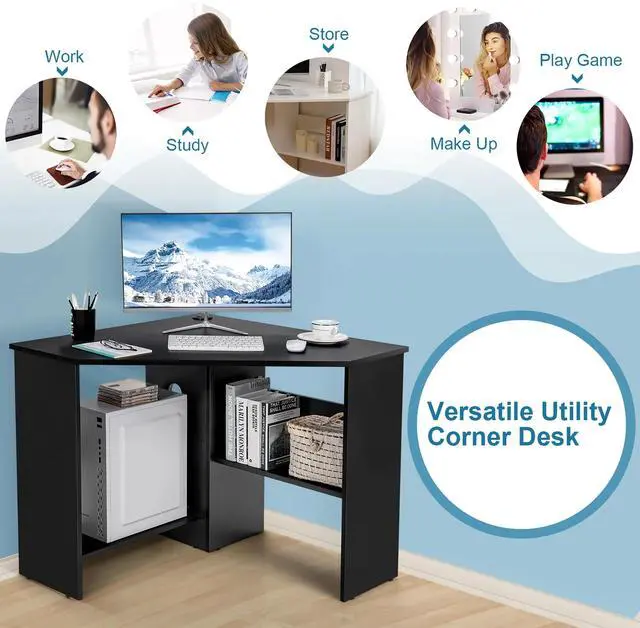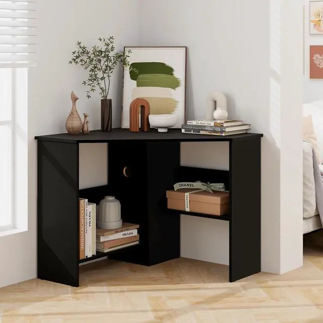 Ample Storage: Includes a spacious tabletop for a laptop and lamp, along with cable management holes for organizing wires, and storage shelves for a host, books, and office supplies.