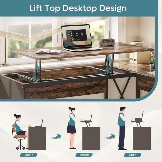 Bestier 55.7 inch L-Shaped Lift Top Desk with Storage, Sit to Stand Computer Desk with Monitor Stand & File Drawer Rustic Brown