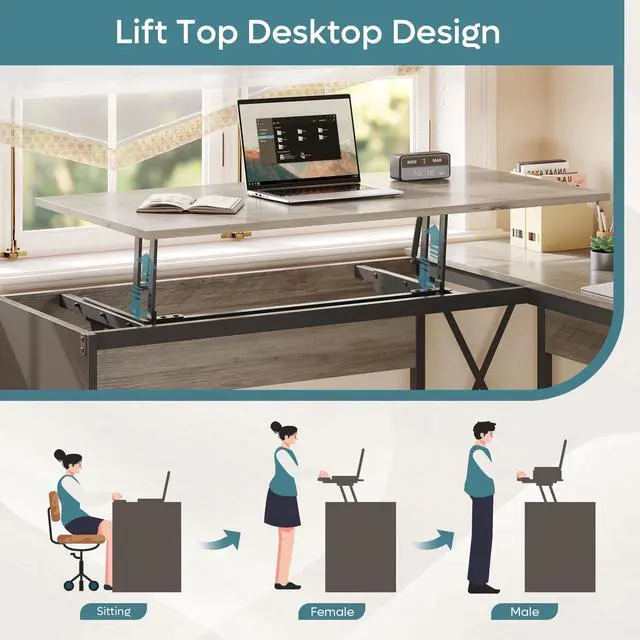 Bestier 55.7 inch L-Shaped Lift Top Desk with Storage, Sit to Stand Computer Desk with Monitor Stand & File Drawer Wash Grey