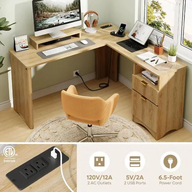 Bestier 55" L-shaped Computer PC Desk Lift Top with Power Outlets Storage Drawers and Monitor Stand, Log