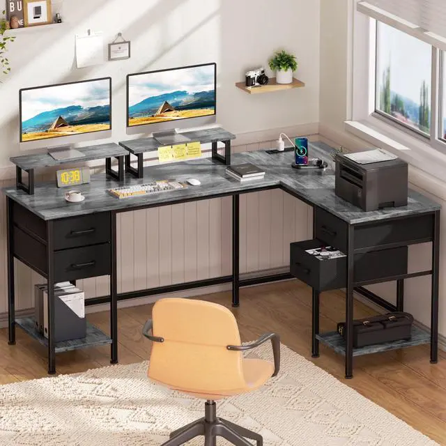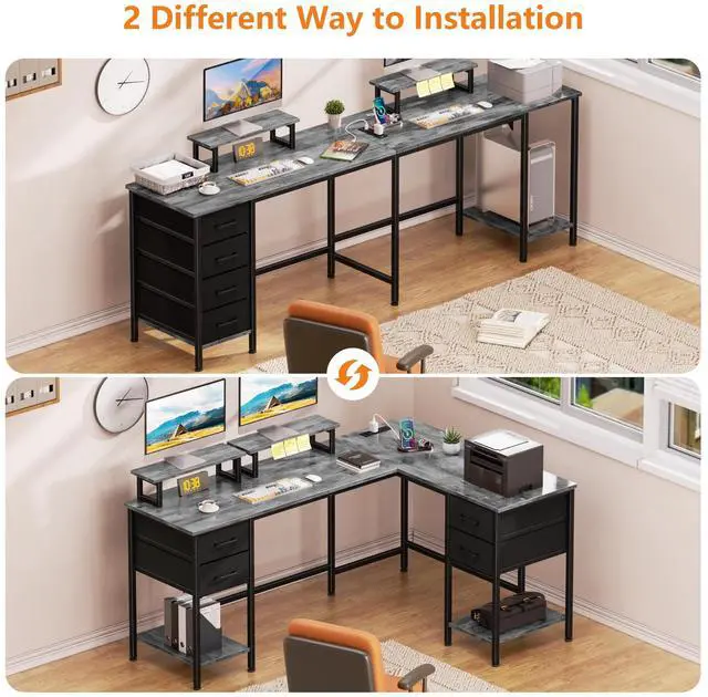 Satifur 59" L-Shaped Desk with Power Outlets, 4 Fabric Drawers & 2 Monitor Stands, Convertible Two Person Home Office Desk,Gray