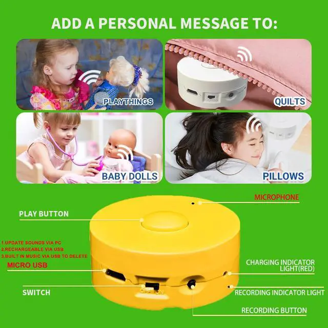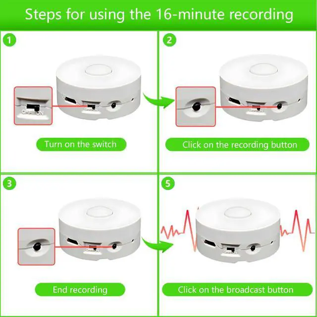 16 Min Clear Recording: The voice recorder is easy to use and can record up to 16 minutes of clear sound through the microphone. Just press and hold for 1 second, and it will start recording when you hear a "beep." You can release the button during recording. If you press the button again, it will stop recording when you hear "two beeps," allowing you to listen to your recorded voice.