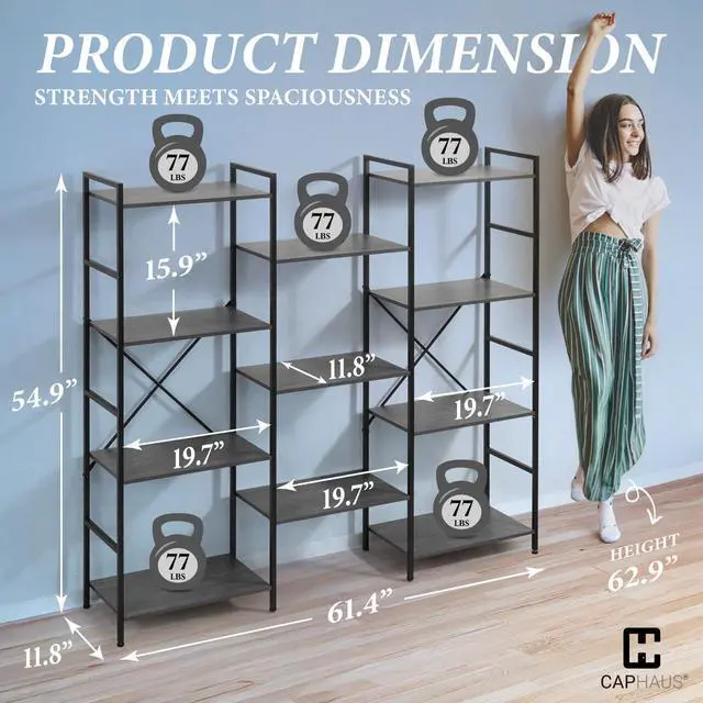Dimensions: Measures 61.4 W x 11.8 D x 54.9 H; features four tiers, each with a depth of 11.8 inches; each shelf supports up to 77 lbs, with a total weight capacity of 847 lbs; provides generous storage while maximizing space in small areas.