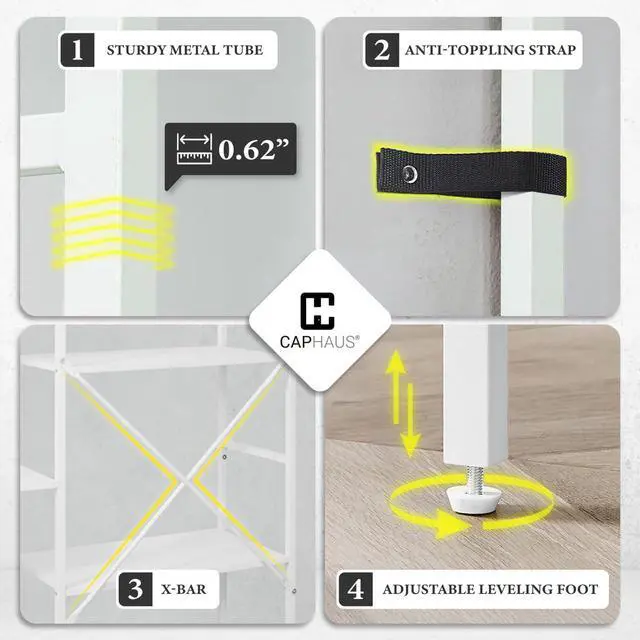 Support and Stability: Equipped with anti-tip hardware for safety, a durable 16mm steel frame for strength, and an X-shaped metal tube for added stability; adjustable feet ensure level placement on uneven surfaces, keeping the shelf securely in place.