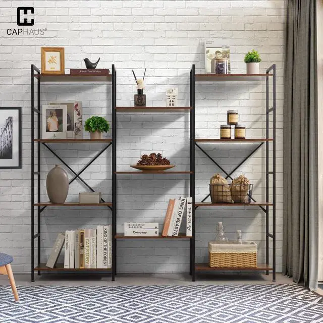 CAPHAUS Triple Column 4 Tier Bookshelf, Industrial Triple Bookcase with 11 Open Display Shelves, Adjustable Wide Shelf for Living Room, Bedroom, Home and Office, Dark Grey