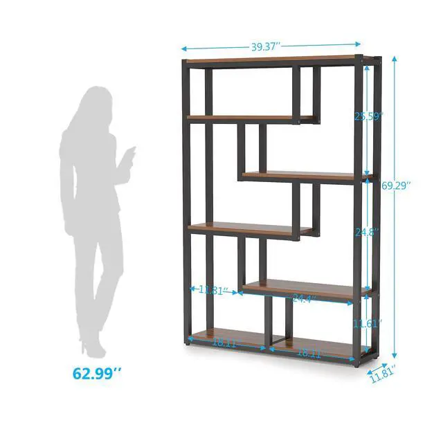 Tribesigns Way to Origin 6-Shelf Industrial Bookshelf, Vintage Etagere Bookcase, 69 Inch Tall Storage Display Staggered Shelves with Sturdy Metal Frame for Home Office, Dark Walnut & Black