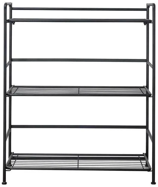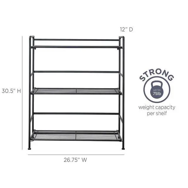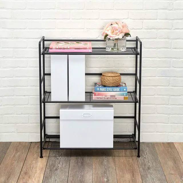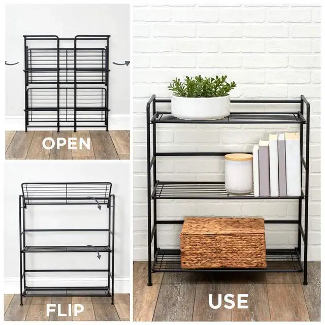 Folding Metal Bookcase-Small Space Solution-No Assembly-Home, Kitchen, Bathroom and Office Black, 3 Shelves, Wide