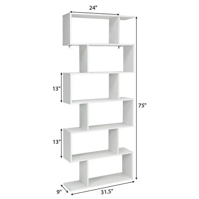 Tangkula 6 Tier S Shaped Bookshelf, 31.5''L x 9''W x 75''H, Wooden Bookcase and Bookshelves w/Anti-Toppling Device, Room Divider Display Shelves for Living Room, Home Decor, 6 Shelf Bookshelf
