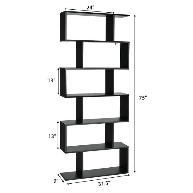 Tangkula 6 Tier S Shaped Bookshelf, 31.5''L x 9''W x 75''H, Wooden Bookcase and Bookshelves w/Anti-Toppling Device, Room Divider Display Shelves for Living Room, Home Decor, 6 Shelf Bookshelf