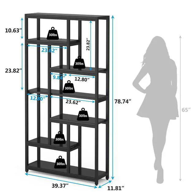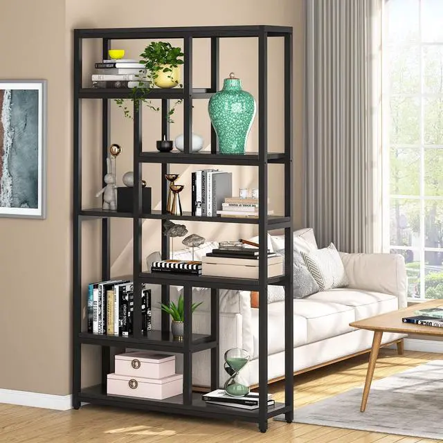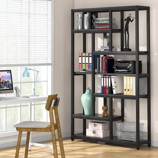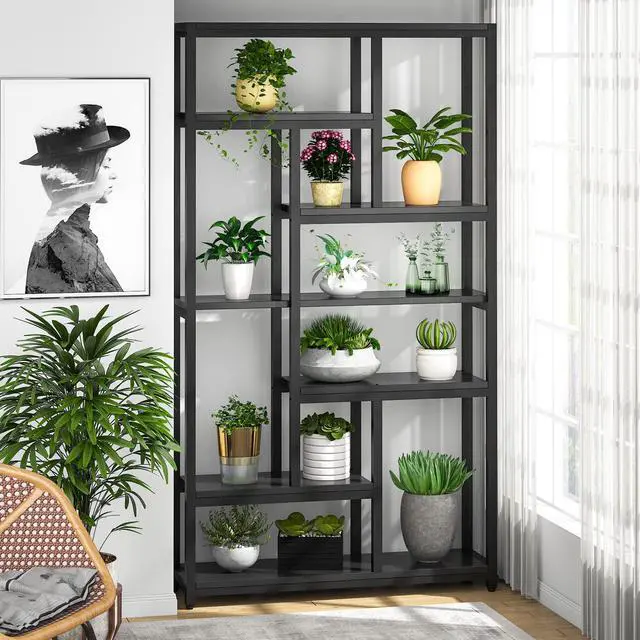 Ample Storage/DisplayFeatures 10 open shelves, this tall bookshelf provide plenty of space for storing and displaying your books, photo frame, pottery, collections, plant, etc. Maximize the vertical wall space and also help keep room tidy and organized