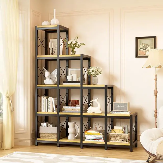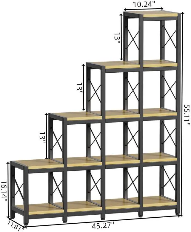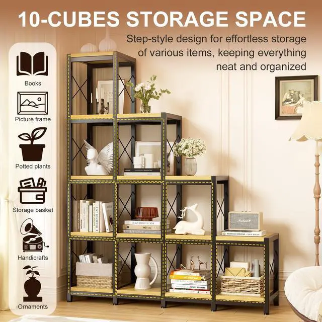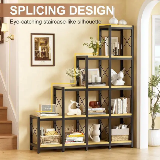 Ladder Design and Combined Assembly- Our 14 Shelves Bookshelf contains 10 cube shaped storage space, creating an eye-catching, staircase-style profile. The organized cube structure, steel frame and wooden board gives it a vintage feel. You can choose to buy two bookshelves, assembled side by side like in our picture, not only very beautiful and atmospheric, but also add more storage space and add an artistic sense to your room.