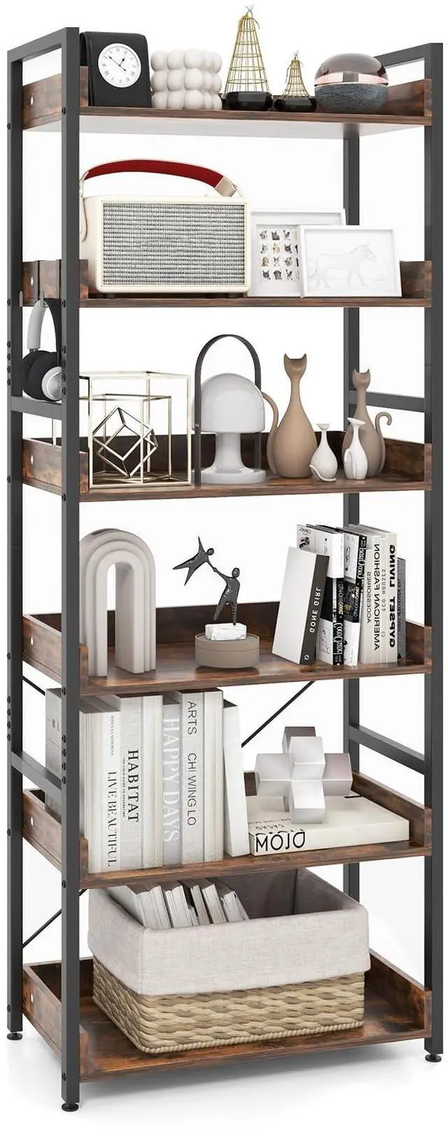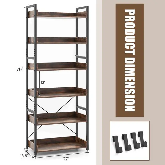 6-tier Bookshelf with 4 Hooks: The industrial bookcase features 6 open shelves to enlarge storage and display space for items, such as books, decorations, photos and potted plants, etc. 4 hooks are convenient to hang your headphone or toys, which can well suit diverse storage needs.