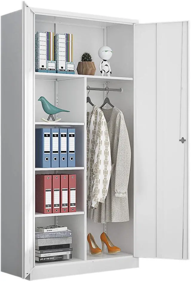 PRACTICAL DESIGN:Our tall metal wardrobe cabinet equipped with lock(2 keys)and 3 adjustable shelves to provide adaptability and convenience, The closet rod is made of thickened steel, so you don't have to worry about it breaking when hanging too many items, it will meet your needs and hold as many items as you want. Regardless of what your storage needs are, you have the ability to create a unique storage space to suit them.