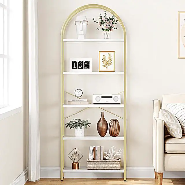 CABIHOME Bookshelf Tall Bookcase Arched Standing Bookshelves Modern Display Racks 5 Tier Storage Rack Shelf Large Wood Book Shelf for Bedroom, Living Room, Home Office