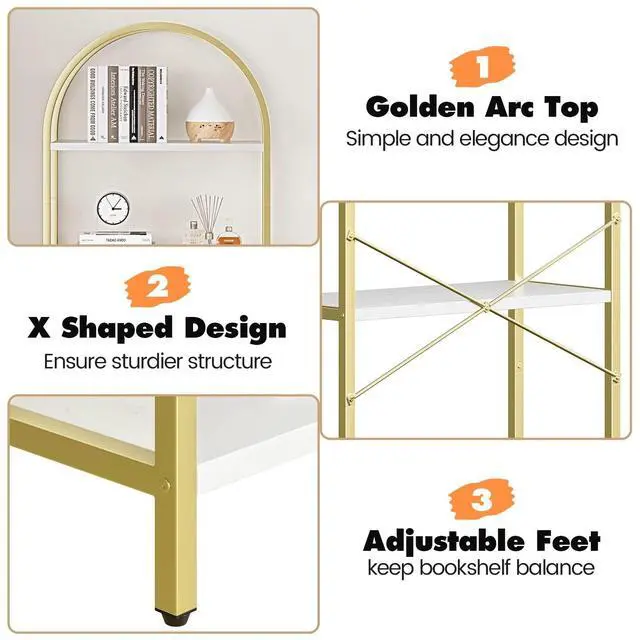 Contemporary Elegance and Opulence: The narrow bookshelf showcases a modern and luxurious design, blending an arc top with golden metal frames featuring a marbling finish to accentuate the sleek lines and airy aesthetic of its construction. The striking two-tone combination of gold and white marbling infuses the piece with a naturally modern ambiance, exuding a sense of sophistication and luxury that elevates the overall look and feel of the space. This gold bookcase exudes a glamorous aesthetic that adds a touch of opulence to any room, delivering a stylish and luxurious vibe while effortlessly complementing a wide range of furnishing items.