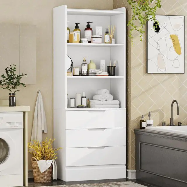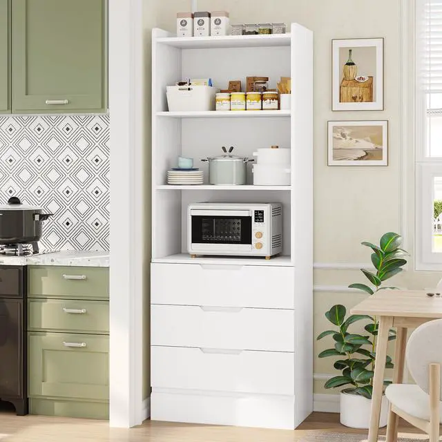DICTAC 73.23'' Tall Storage Cabinet Bookcase with 3 Drawers and 3-Tier Open Shelves Wooden Bookshelf Kitchen Pantry Storage Organizer Cabinets for Living Room, Study, Kitchen,Bathroom,White